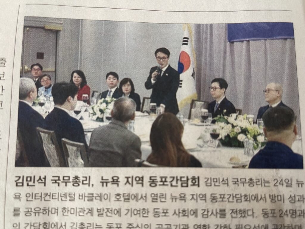 김민석 국무총리는 1월 24일, 뉴욕 인터컨티넨털 바클레이 호텔에서 열린 뉴욕 지역 동포간담회에 참석해 방미 성과를 공유하고, 한미 관계 발전에 기여해 온 동포 사회에 감사의 뜻을 전했다.