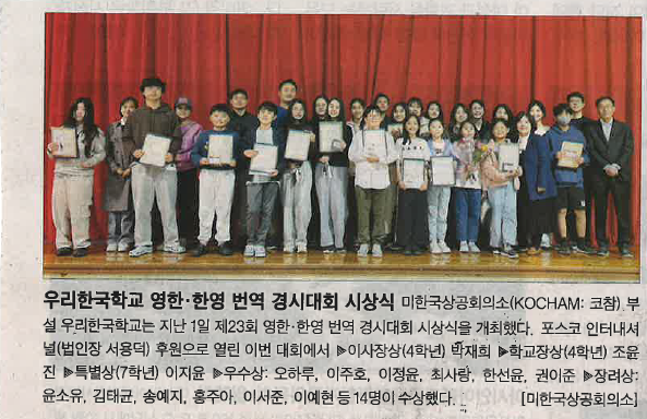KOCHAM 부설 우리한국학교 한영·영한 변역 경시대회 시상식