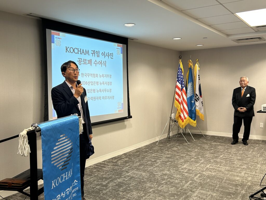 또한 한국으로 귀임하시는 이준봉 한국무역협회 뉴욕지부장, 윤태정 KDB산업은행 뉴욕지점장, 이진 한국수출입은행 뉴욕사무소장, 김광진 한국수력원자력 미주지사장의 공로패 수여식이 진행되었으며, 미주 한인 경제 발전과 KOCHAM 활동에 기여한 공로에 대한 감사의 뜻을 전했습니다.