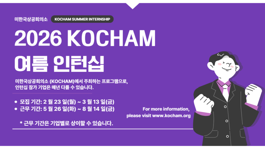 미한국상공회의소(KOCHAM)에서는 여름방학 동안 한인 동포 대학생들에게 한국 기업의 이해와 현장 실무 경험을 제공하고자 아래와 같이 2026 KOCHAM 여름 인턴십 프로그램을 오는 5월 27일부터 8월 15일까지 진행합니다. 본 프로그램은 한인 동포 대학생을 KOCHAM 회원사 등에 배치하여 한국 기업에 대한 이해와 다양한 분야 진출의 기회를 제공하고 있습니다.